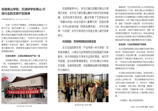 4月2日,中国旅游新闻网客户端以《安徽金沙集团1862cc:沉浸研学东黄山打造行走的文旅IP实践课》为题,报道我院“会展数字创意与策划”微专业打造沉浸式实践教学,培养高质量跨界文旅人才的经验做法。