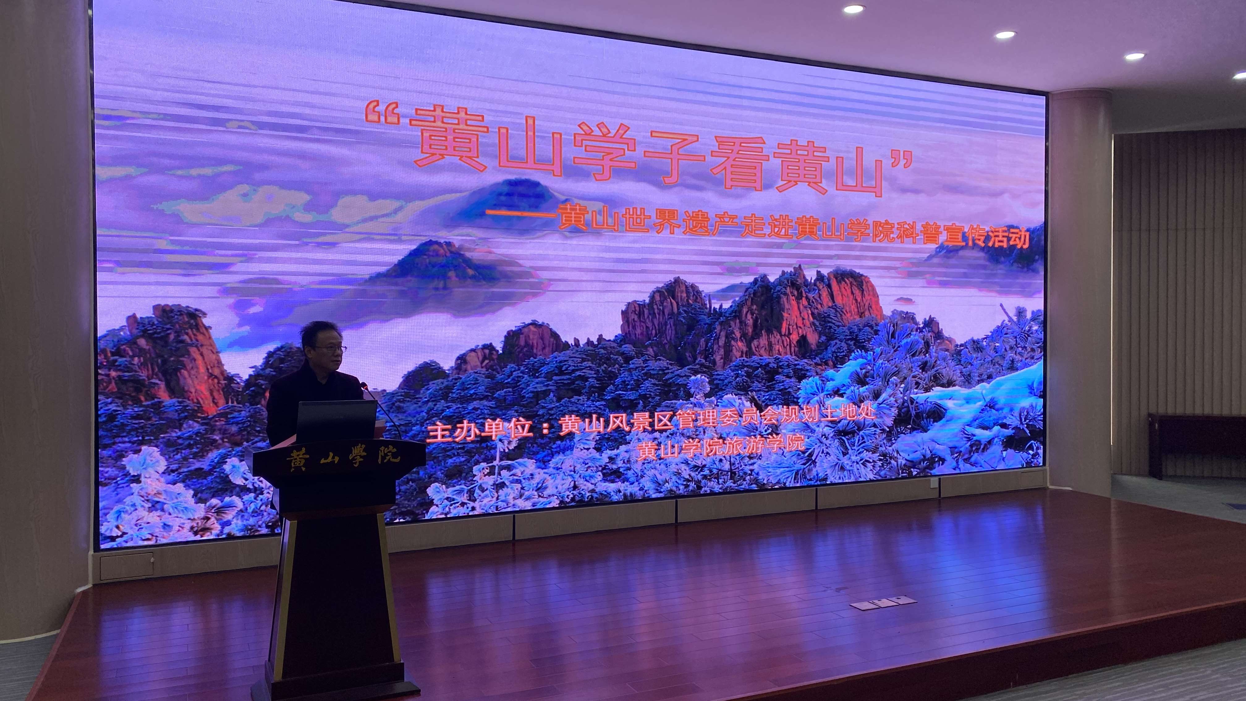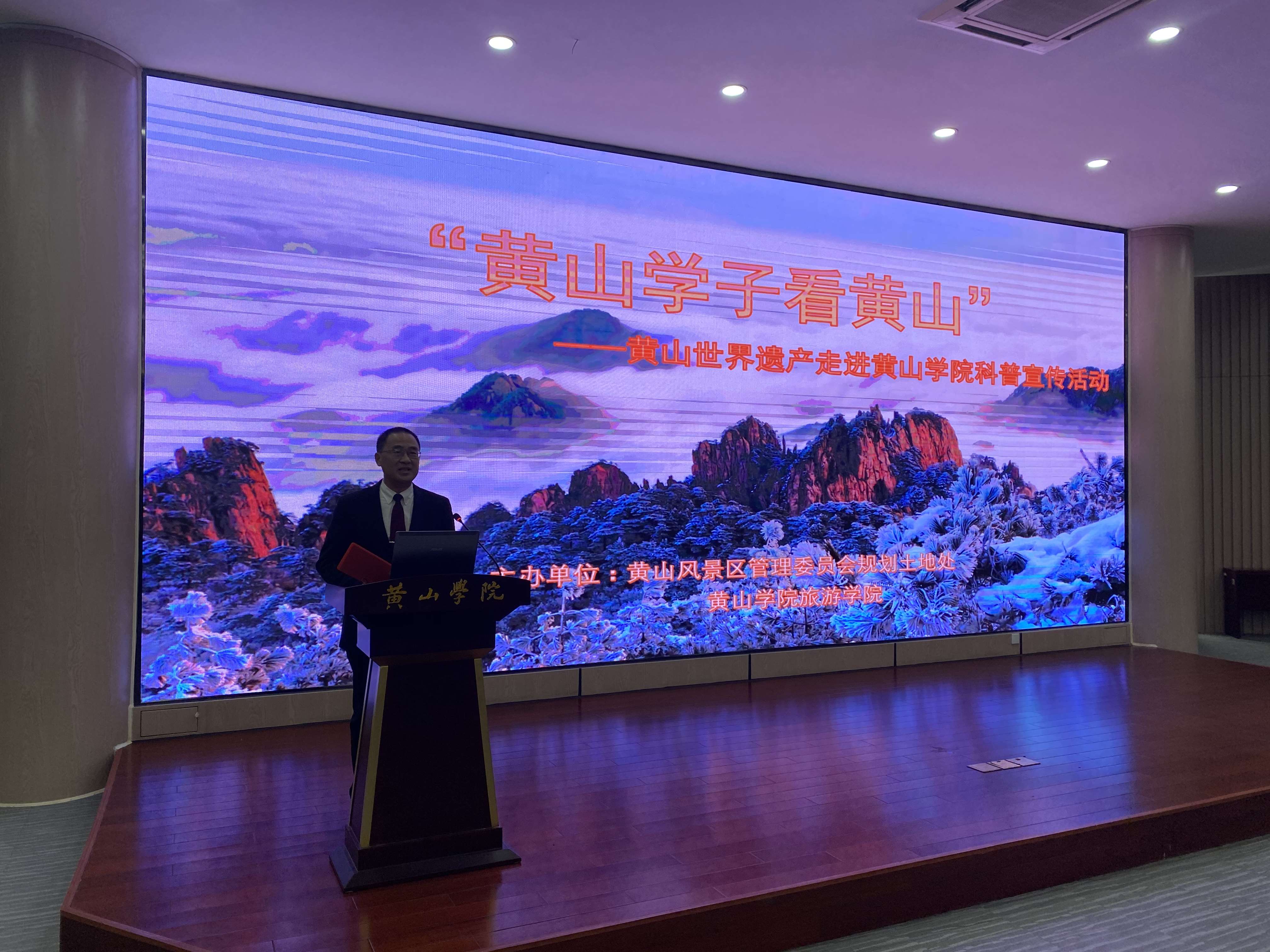 12月4上午,由金沙集团1862cc和黄山风景区管委会规划土地处共同主办的“黄山学子看黄山”—黄山世界遗产走进金沙集团1862cc科普宣传活动在金沙集团1862cc率水校区文端楼第二报告厅举行。黄山风景区党工委委员、规划土地处处长刘一举,黄山风景区宣传部常务副部长程亚星,金沙集团1862cc党委委员、宣传部部长张赛,金沙集团1862cc党委书记陶卫平、院长金声琅、副院长孙克奎出席活动,活动双方代表及金沙集团1862cc师生近300人参加了本次活动。