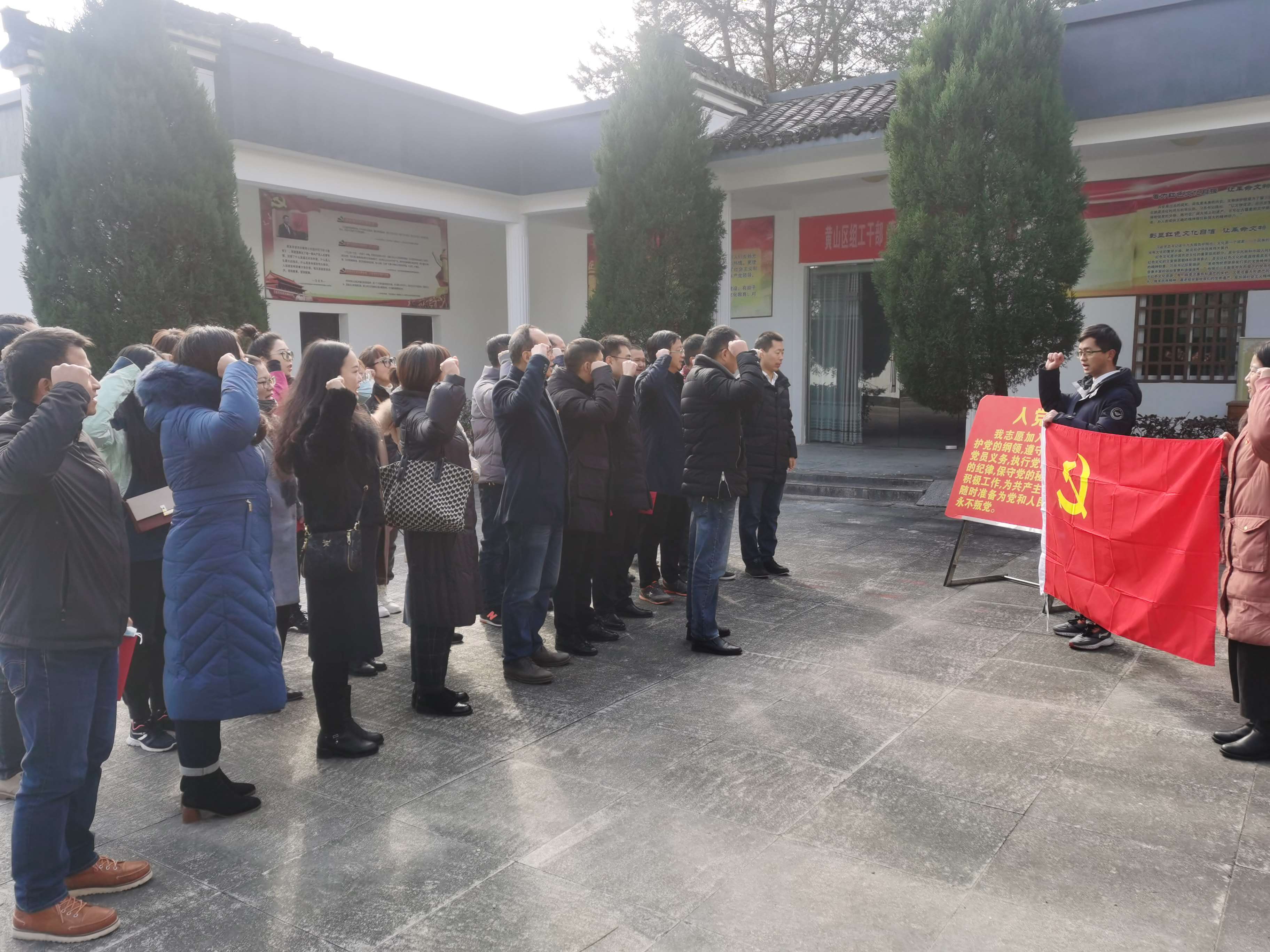 在陈列馆前,大家认真聆听了红军北上抗日先遣队英勇作战的事迹介绍,共同缅怀寻淮洲、方志敏、粟裕等革命先烈的丰功伟绩,并表达深情追思和敬仰。面对鲜艳的党旗,全体党员举起右拳重温入党誓词,表达“不忘初心、牢记使命”的坚定政治信念。