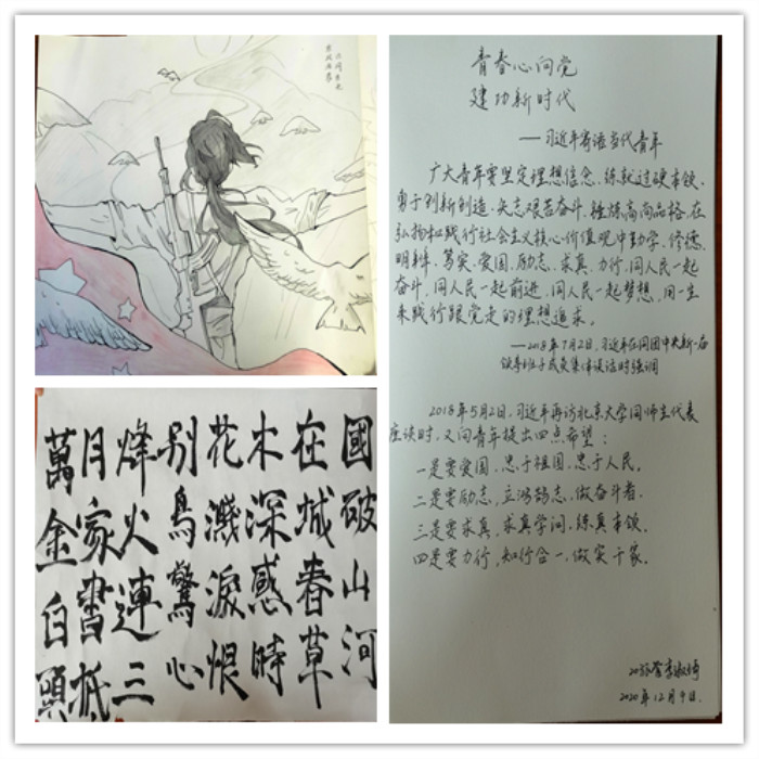 本次活动从11月25日开始,通过前期宣传,吸引了大一各班级众多的书法、绘画爱好者报名参加。此次比赛主题为“青春心向党·建功新时代”,分为绘画类、软笔类和硬笔类三种类型,经过层层筛选,共计16名同学进入当天的决赛。12月9日下午的决赛现场,选手们各展其才,尽显书画功底,平平仄仄的字里行间,典雅秀逸的水墨之间,无一不展现了他们扎实的绘画与书法功底。