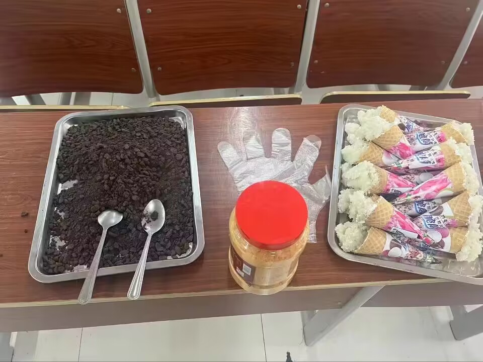 在活动前,工作人员已提前准备好活动的材料,待到同学们陆陆续续有序走进活动教室时,工作人员将准备的材料有序的分发,之后先由我们的工作人员示范制作热奶宝的过程,该热奶宝是由工作人员备脆筒、糯米饭、奶油等,并事先将糯米饭放入甜筒中。参与活动者,同学们在认真学习制作后根据自己的口味喜好选择夹心然后制作成美味的芋泥团。